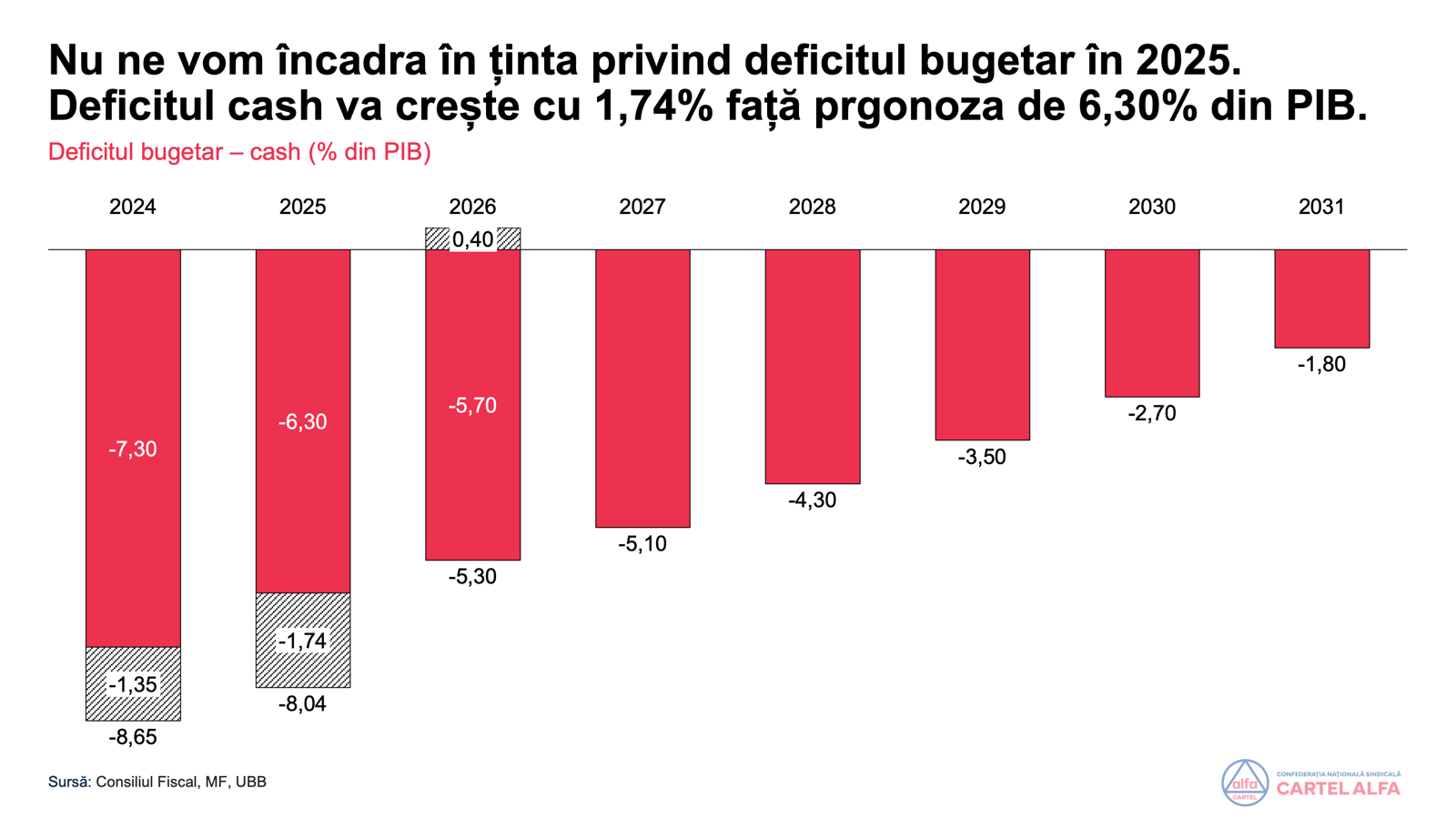 Conform acestei analize, deficitul cash (atenție, nu ESA care include și plățile programate, dar neachitate) ar ajunge la 8,04% din PIB în 2025. Creșterea este cu 1,74% față de valoarea prognozată de Ministerul de Finanțe de 6,30% în Planul Bugetar Structural Național pe Termen Mediu: